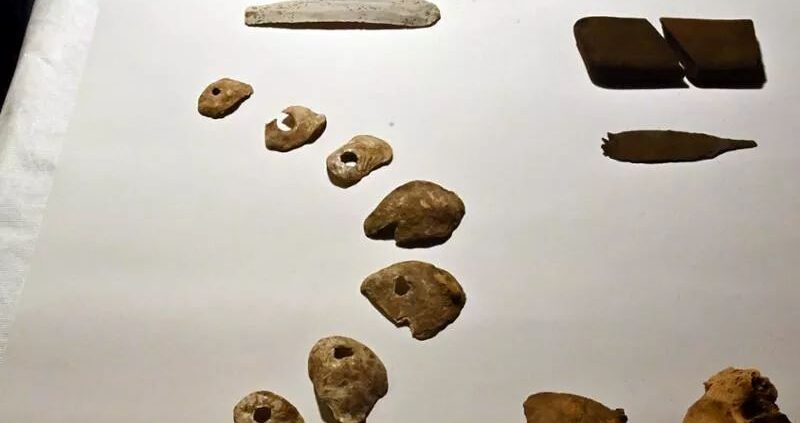 Materiali portati in superficie da animali, tra cui punte di freccia in selce, lunghe lame dello stesso materiale prodotte a pressione, un manufatto in ossidiana (vetro vulcanico importato dal sud Italia o dal centro Europa), asce in pietra levigata, altri manufatti litici e ceramici e ornamenti in conchiglia dimostrano che la grotta è stata frequentata per millenni e fanno ben sperare per le future campagne di scavo.