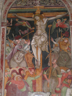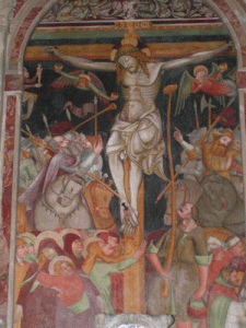 L’altare maggiore in marmi policromi è posto davanti all’affresco della Crocifissione, riportato alla luce in un momento successivo; quest’opera fu realizzata da un pittore d’oltralpe del XV secolo. Sono, poi, presenti due tele: l’Adorazione dei pastori e l’Adorazione dei Magi e una pala appartenente a Gaspare Narvesa, raffigurante la Visitazione di Maria a sant’Elisabetta datata 1588.