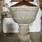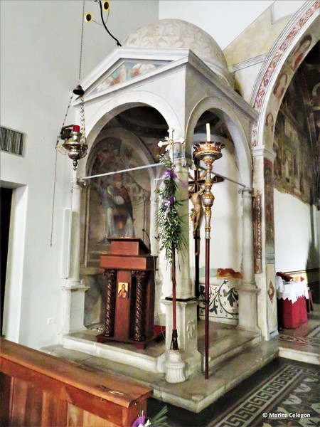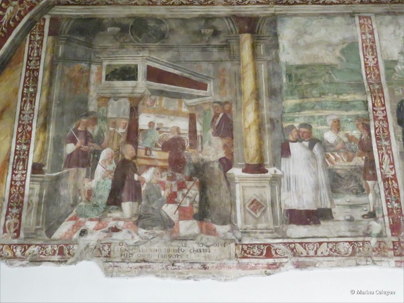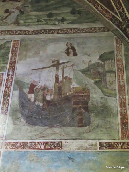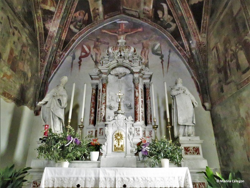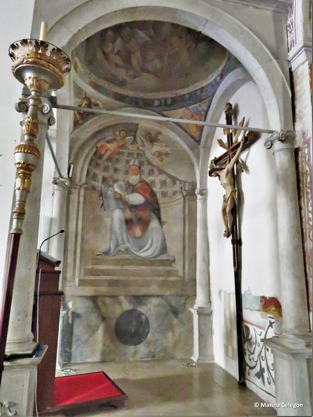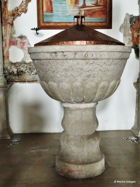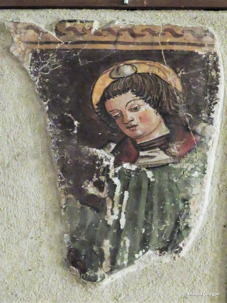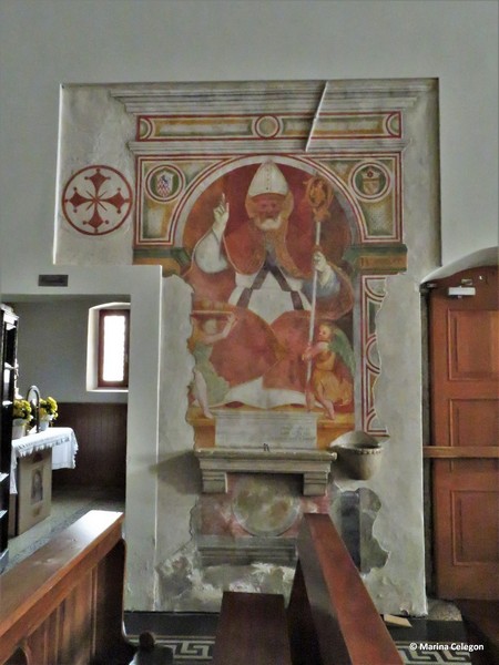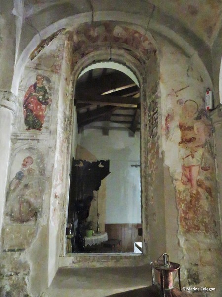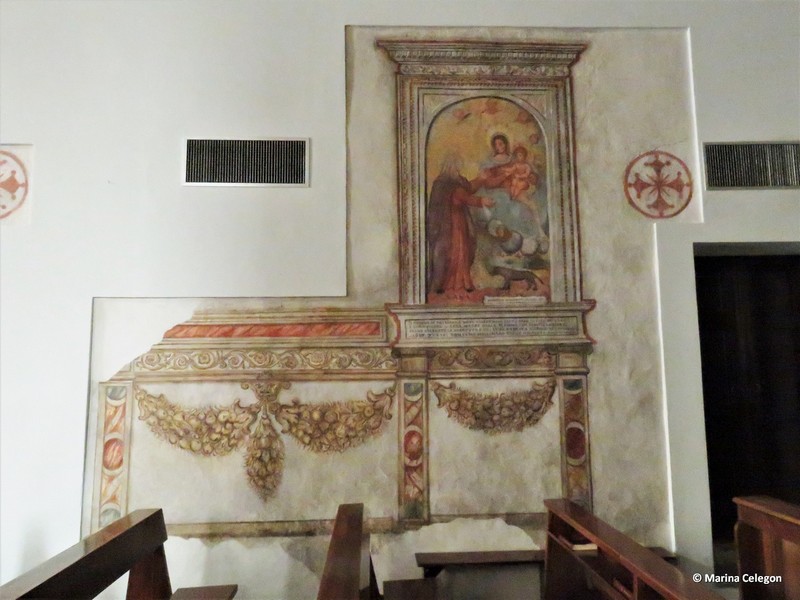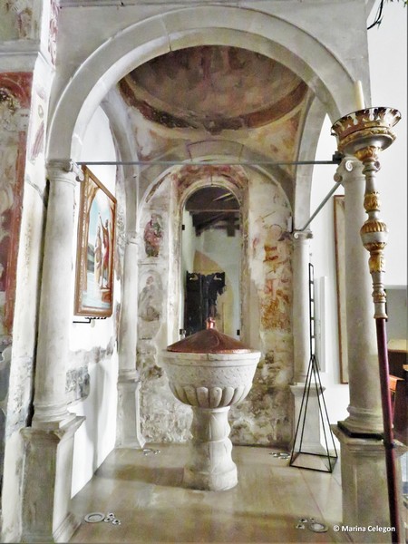 I lacerti di affreschi raffiguranti scene sacre situati nell’edicola destra, sono ritenuti del XVI secolo e della scuola dell’Amalteo. Nell’edicola è contenuto il fonte battesimale in pietra che riporta incisa la data del 1486 e sulla parete destra una finestrella si apre su un ambiente laterale.