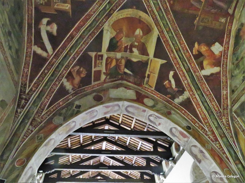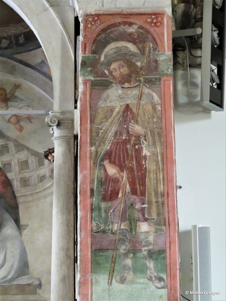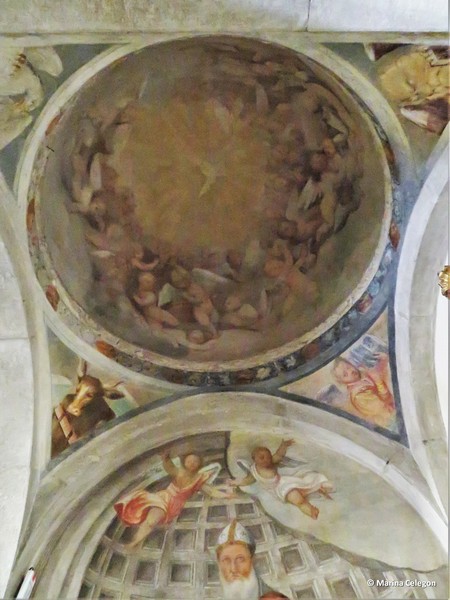 Nell’intradosso dell’arco trionfale si vedono le figure intere di San Rocco e San Leonardo e tra questi busti di vescovi o patriarchi. Nelle vele della volta le figure dei quattro Dottori della Chiesa e degli Evangelisti in cattedra occupano a coppie le vele mentre nei pennacchi vi sono figure di Profeti e i Simboli degli Evangelisti.