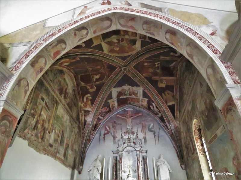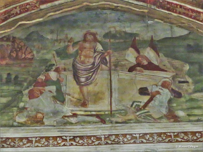 Sulla parete destra, al di sopra della finestra, si vede una Natività con l’Adorazione dei pastori. Nelle lunette delle pareti si trovano a sinistra la Deposizione, al centro la Crocefissione, a destra la Resurrezione.