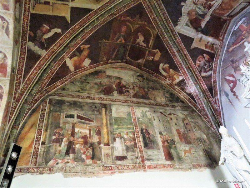 Affrescate sono anche le due edicole presenti ai lati dell’arcosanto. Gli affreschi di quella di sinistra raffigurano sulla parete nord San Nicola (o Sant’Agostino?) e sulla cupola una Gloria celeste, piena di angeli e con i simboli degli evangelisti. Questi affreschi sono attribuiti da alcuni a Pomponio Amalteo, (1505 –1588) da altri a Giovanni Antonio de Sacchis detto il Pordenone (1483 o 1484 – 1539).