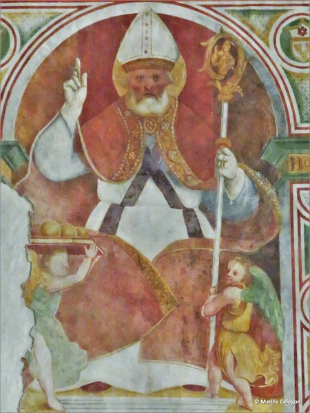 Il ciclo pittorico, incentrato su episodi delle vite del Cristo e di San Nicolò, si sviluppa sulle pareti all’interno dell’abside su tre livelli. A partire dal basso una prima fascia (sopravvissuta solo sulla parete destra) mostra, sopra allo zoccolo decorato con motivi vegetali, l’Attraversamento del Mar Rosso e il Battesimo di Cristo. Una cornice con leoncini e fogliami separa queste scene dal registro superiore, in cui vengono raffigurati Episodi della vita di S. Nicolò tra i quali sono riconoscibili a sinistra forse l’episodio della Carestia di Mira e quello di tre ragazze salvate dall’essere vendute, a destra l’Elemosina di San Nicola e San Nicola che placa la tempesta.