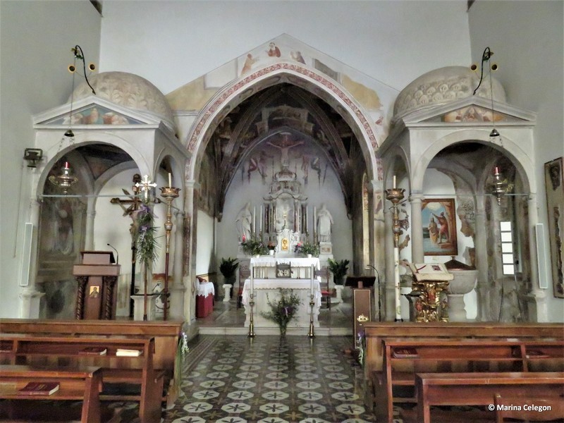 All’interno l’edificio è a navata unica con soffitto a capriate e copertura in coppi. La copertura della zona presbiteriale è ad un livello inferiore rispetto a quella della navata.