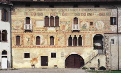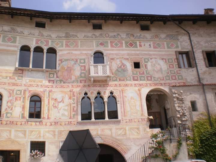 La costruzione occupò lo spazio disponibile con una forma circolare e con uno spazioso cortile interno, protetta da un fossato che si poteva oltrepassare solo con un ponte levatoio. L’insieme delle costruzioni castellane giunte sino a noi è il risultato di varie fasi costruttive, fra le quali spicca la facciata dipinta del palazzo quattrocentesco con belle trifore gotiche e rinascimentali e con affreschi attribuiti al Bellunello, databili tra il 1480 e il 1490.