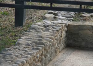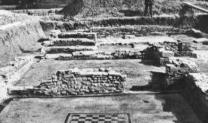 La prima fase, databile alla seconda metà del I secolo a.C., consiste in tre ambienti contigui affacciati su uno spazio aperto (è la parte più a est). La muratura perimetrale, in ciottoli di fiume, è rafforzata esternamente da pilastri angolari, mentre l’interno, ancora in buono stato, presenta un pavimento in signino, ossia un battuto di frammenti calcarei e di malta, lisciato superiormente e decorato da inserti volutamente casuali di sezioni di ciottoli e pietre colorate.