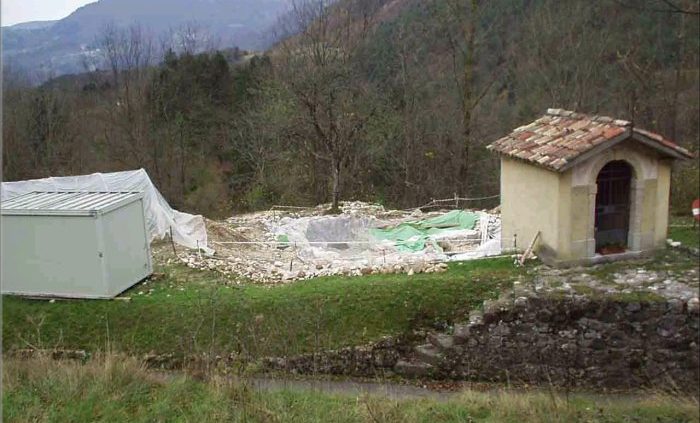 Scendendo con lo scavo si è infatti ritrovata una chiesetta di dimensioni modeste (di circa 40 mq) caratterizzata da una pianta rettangolare ad abside rettilinea, con partizione centrale che individua due distinti ambienti quadrangolari, probabilmente separati anche nelle funzioni. Addossata all’angolo sud-ovest si è posta in luce una vasca quadrangolare di poco meno di un metro per lato e intonacata all’interno, che mostra analogie stringenti con simili strutture paleocristiane rinvenute a Ragogna, San Vigilio di Palse, Osoppo, lì interpretate come fonti battesimali.