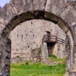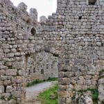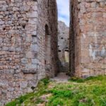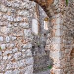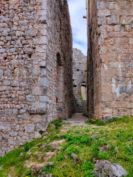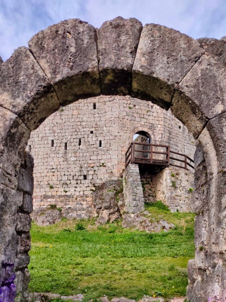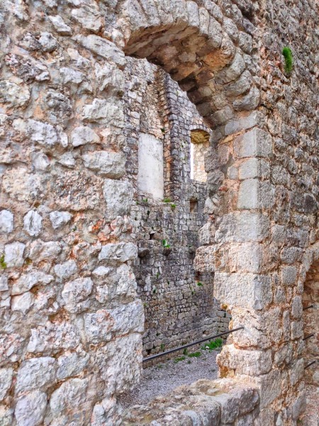 Arrampicandosi dal lato della montagna si sale all’altezza del primo piano, qui si accede attraverso un passaggio ad arco, il quale ha un balcone con mensole sporgenti (due pezzi di roccia non squadrati). Da questo passaggio è possibile osservare qualche pezzo rimesso in opera di grosso laterizio di età romana (il castello è situato su una specola romana).