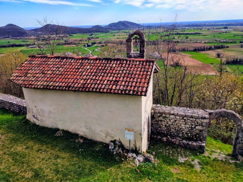 L’aula liturgica nasce molto probabilmente con il complesso castellano anche se Marchetti la colloca nel più tardo XIII secolo. L’edificio presenta evidenti interventi, che si sono succeduti nel corso del tempo, e si trova ora in stato di abbandono, completamente spoglia degli arredi interni. Era probabilmente funzionante al tempo del lascito Francesco di Toppo (1876)… Alla fine degli anni Sessanta, come testimonia Andrea Benedetti in un articolo riguardante il complesso castellano, la chiesa era dotata di un altare con una piccola statua di S. Antonio. L’aula, in quegli anni, era ancora utilizzata per le funzioni religiose con la celebrazione della messa nella giornata delle rogazioni, che si facevano prima dell’Ascensione.