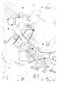 La cortina comprendeva parte del centro urbano senza avere una forma specifica. La limitata conservazione delle strutture murarie non permette di ricostruirne il percorso. Tuttavia è noto che la cortina avesse due porte poste, rispettivamente all’inizio dell’odierna via Sant’Antonio e all’inzio di via Marconi, entrambe difese da torri portaie.