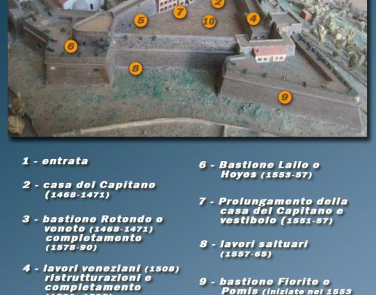La parte più antica del castello corrisponde al settore in cui oggi è ospitato il Museo storico. Dopo la resa della città ai Veneziani, nei primi anni del 1500, il primitivo castello venne da questi rafforzato ed assunse l’odierna forma triangolare, con ai vertici tre bastioni rotondi.