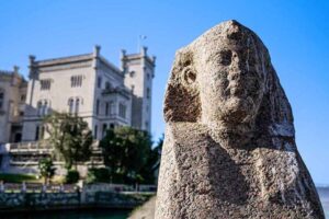 Rimane comunque a Trieste un’unica superstite di cotanta passione, la piccola sfinge in granito rosa che, come una gatta distesa al sole, si affaccia dalla punta del molo di ingresso del porticciolo di Miramare. Scultura egizia con il corpo di leone e la testa di donna, dallo sguardo imperturbabile ed indecifrabile, solitamente collocata vicino alla tomba del faraone per augurare al re una serena vita dopo la morte, ancora oggi, dopo tantissimi anni continua a vegliare sulla dimora del suo caro padrone.