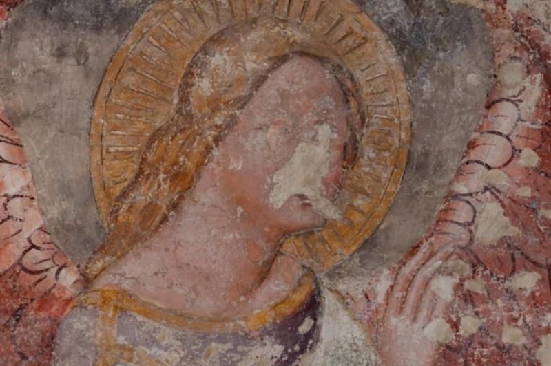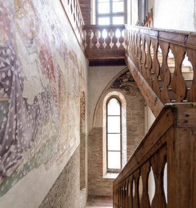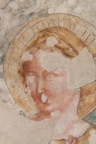 Gli spazi restituiti e restaurati offrono alla vista su due pareti, salendo la scala che conduce all’organo, affreschi frammentari raffiguranti l’Annunciazione, sulla parete laterale, e la Crocifissione, su parte della parete di fondo, dove rimane anche una delle due monofore originali che fa entrare la luce nell’ambiente. Sopravvive anche un frammento di imposta della volta a crociera con costoloni che ricopriva la cappella.