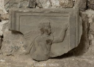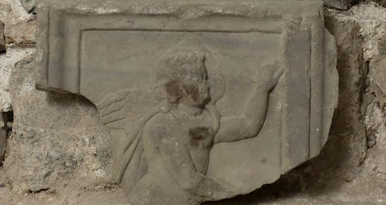 L’erote alato, visibile fino alla vita, si presenta nudo con un mantello sulle spalle e, forse, un drappo intorno alla vita; inoltre, è privo della mano destra e presenta l’ala destra spezzata in punta. Nella figura si può riconoscere un erote reggitabella, simbolo molto diffuso sui sarcofagi e, per questo, si possono trovare dei confronti con alcuni esemplari aquileiesi.