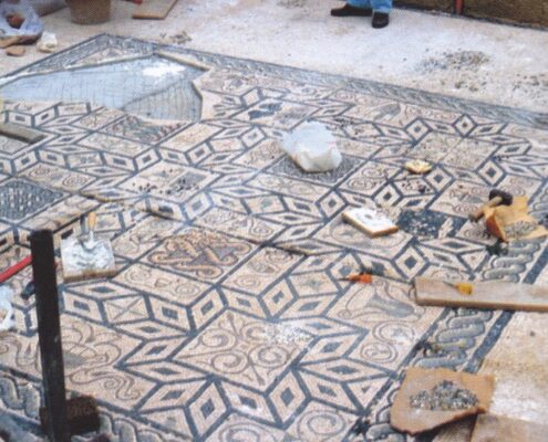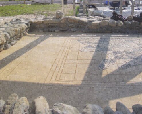 Nell'ambito della Villa di Ronchi, si evidenzia un mosaico bicromo composto da un campo bianco a ordito obliquo, al cui centro si sviluppa un tappeto decorativo formato da motivi geometrici tra loro intrecciati: una composizione “ad alveare”…