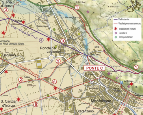 Negli anni Settanta del Novecento, l’archeologa Luisa Bertacchi segnalò, nel greto dell’Isonzo, circa due chilometri a sud del ponte di Pieris, la presenza di numerosi blocchi di calcare grigio, accuratamente squadrati e disposti “a spina”…