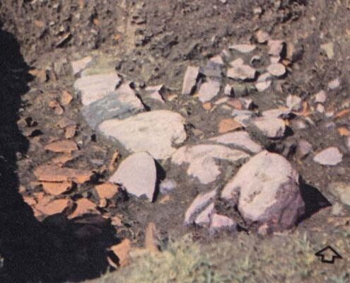 Nel campo detto “Monumens” vennero scoperte diverse tombe terragne di età altomedievale (tardo VII secolo). Nello stesso contesto, furono rinvenuti molti oggetti, 46 in tutto: spade, coltellacci (scramasax), coltelli, cuspidi di lancia…